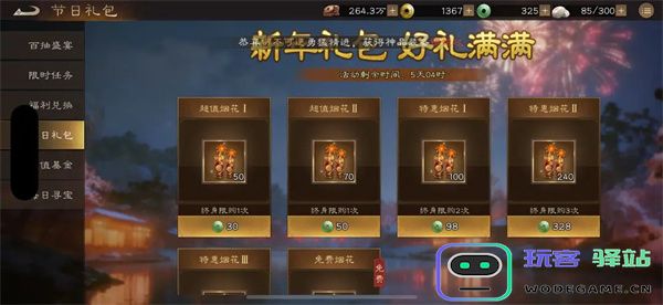 ◦ 超值烟花Ⅰ(30玉=50烟花)、Ⅱ(50玉=70烟花):终身限购1次,性价比最高。