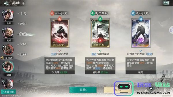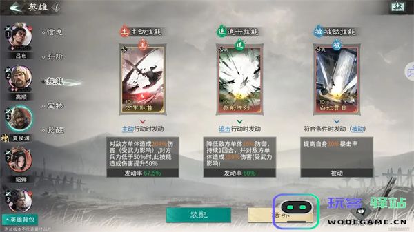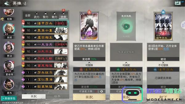 被动技能:推荐携带缮甲厉兵,前3回合开始,己方全体获得1层80%抵挡。可以大幅度提升我军前期的坦度。
